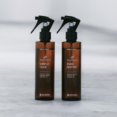 自然由来の消臭・抗菌成分を配合したファブリックミストを、「ピュアインスパイア」と「シンプルカーム」の2本セットでお届け。
