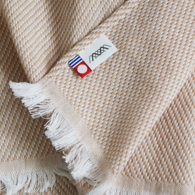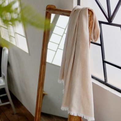 愛媛県今治で素材にこだわったタオルを生産している《WATANABE PILE》から、ざっくりとバスケットのように織り上げた大判ストールをお届け。